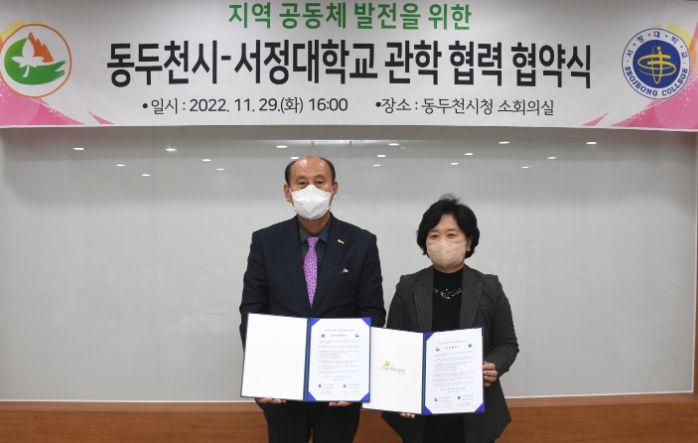 [한국기자연대] 동두천시는 지난 29일 서정대학교(총장 양영희)와 지역 공동체 발전을 위한 관·학 협력 협약을 체결하고 상호협력을 약속했다.