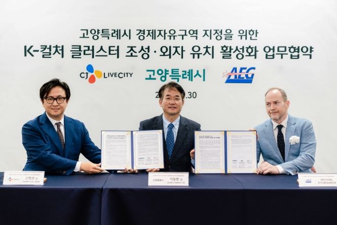 고양시는 30일 일본 오사카에서 AEG, CJ라이브시티(CJ LiveCity, 대표이사 신형관)과 ‘K-컬처 클러스터 조성 및 외자 유치 활성화를 위한 삼자 간 업무협약(MOU)’을 체결했다고 1일 밝혔다. AEG와 CJ라이브시티가 고양시의 경제자유구역 추진 5대 전략 중 하나인 ‘K-컬처 클러스터’ 구축을 위해 시와 다각도로 협력하기로 했다.
