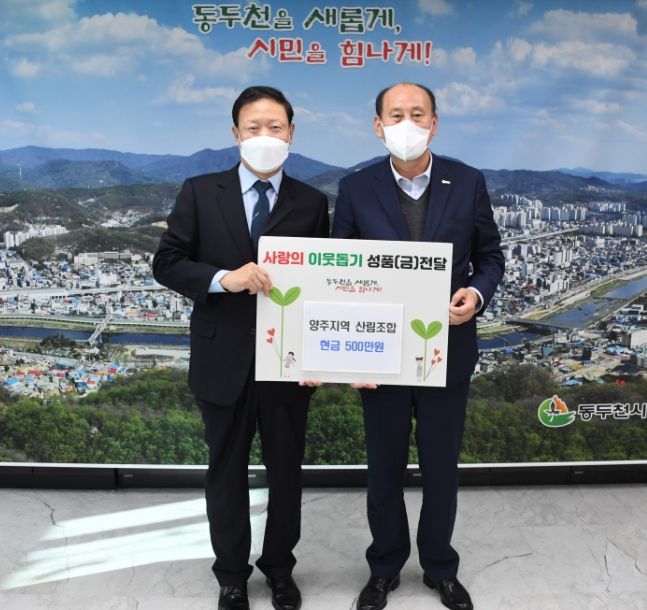 [한국기자연대] 양주지역산림조합은 지난 2일 동두천시(시장 박형덕)를 방문해 지역사회 어려운 이웃들을 위한 성금 500만원을 전달했다.