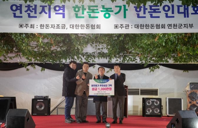 [한국기자연대] (사)대한한돈협회 연천지부는 지난 7일 구석기 커피농장 식물원 카페블라에서 ‘연천지역 한돈농가 한돈인대회’를 열고 관내 소외계층을 위한 성금과 장학금 총 1600만원을 연천군에 기탁했다.