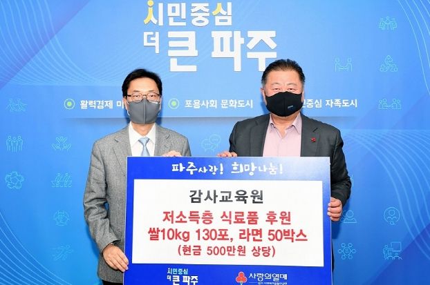 [한국기자연대] 파주시는 8일 감사교육원에서 파주시 취약계층을 위해 현금 500만원 상당의 쌀 1,300kg과 라면 50박스를 전달받았다고 밝혔다.