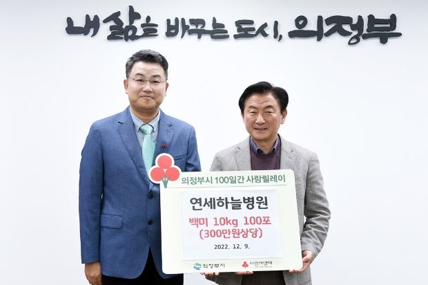 [한국기자연대] 의정부시는 12월 9일 연세하늘병원(병원장 오승준)에서 시청을 방문해 백미 100포(300만 원 상당)를 기부했다고 밝혔다.