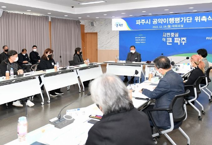 시는 19일, 시민과 각계 전문가 16명을 민선8기 파주시 공약이행평가단으로 구성, 위촉식과 회의를 개최하고 선거 당시의 공약을 통합·조정해 144건의 공약을 최종 확정했다.