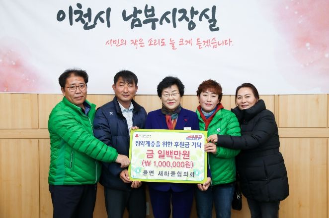 [한국기자연대] 이천시 율면 새마을협의회는 20일 이천 남부시장실에서 연말연시 저소득 취약계층을 위해 사용해 달라며 이천시와 율면“행복한 동행”에 후원금 1백만 원씩을 기탁했다.