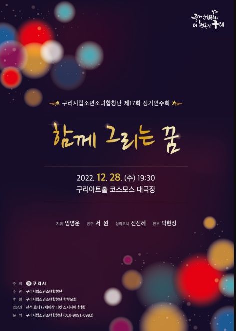 [한국기자연대] 구리시에서는 구리시립소년소녀합창단이 오는 12월 28일 19:30부터 90분간 구리아트홀 코스모스 대극장에서 '함께 그리는 꿈'이라는 주제로 제17회 정기연주회를 개최한다고 밝혔다.