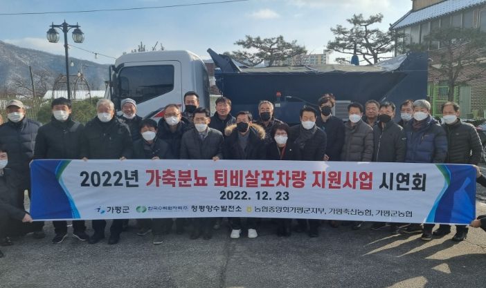 [한국기자연대] 가평군은 12월 23일 가평군의회, 가평축협장, 농협중앙회 가평군 지부장, 가평군농협장, 청평양수발전소장, 축종별 축산단체장등과 함께 『가축분뇨 부숙퇴비 살포차량』에 대한 전달식 및 시연회를 개최했다.