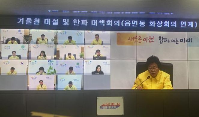 아울러, 김경희 이천시장은 이번 비대면 재난대응 읍면동 첫 화상회의 주제로 “겨울철 대설 및 한파 대책”을 담당부서장 및 읍면동장이 참석한 가운데 ▲부서별 주요 추진사항 ▲읍면동 이면도로 제설 대책 ▲읍면동 한파 지원 사항 등 중점 추진사항을 점검했다.