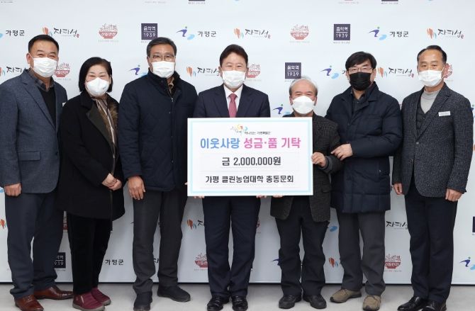이날 전달식에 참석한 가평 클린농업대학 총동문회 정용칠 회장은 “경제불황에 추위까지 겹치면서 더욱 힘든 시기를 보내고 있는 이웃들에게 조금이라도 도움이 되길 바라는 마음으로 준비했다.”며 “앞으로도 지역사회 기여에 앞장 설 수 있도록 저소득층을 위한 후원을 꾸준히 이어가겠다.”라고 말했다.