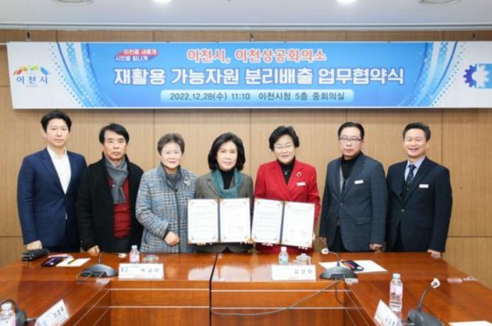 [한국기자연대] 이천시는 2022년 12월 28일 이천시청에서 이천상공회의소, 기업인 협의회 하이트진로 외 83개 관내 기업체와 재활용가능자원 분리배출을 위한 업무협약을 체결했다.