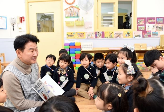 [한국기자연대] 김동근 의정부시장은 23일 의정부시청 직장 의돌이어린이집을 찾아 올해 7세가 된 아이들에게 ‘진정한 7살’이라는 책을 읽어주며 어린이집에서 가장 큰 선배가 되는 아이들의 소감과 아이들이 의정부시에 바라는 점에 대해 자유롭게 이야기하고 소통하는 시간을 가졌다.