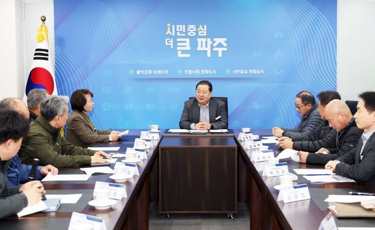 [한국기자연대] 파주시가 8일, 마장호수 주변 지역주민들과 상생협력 간담회를 개최했다. 이날 간담회에는 김경일 파주시장, 마장호수 발전협의회 회장인 기산1리장을 비롯한 마장호수 주변 지역 9개리 이장 등이 참석했다.