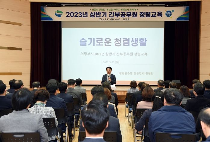 [한국기자연대] 의정부시는 3월 27일(월) 시청 대강당에서 김동근 의정부시장을 비롯한 5급 이상 간부 공무원 80여 명이 참석한 가운데 '2023년 상반기 간부 공무원 청렴 교육'을 실시했다.