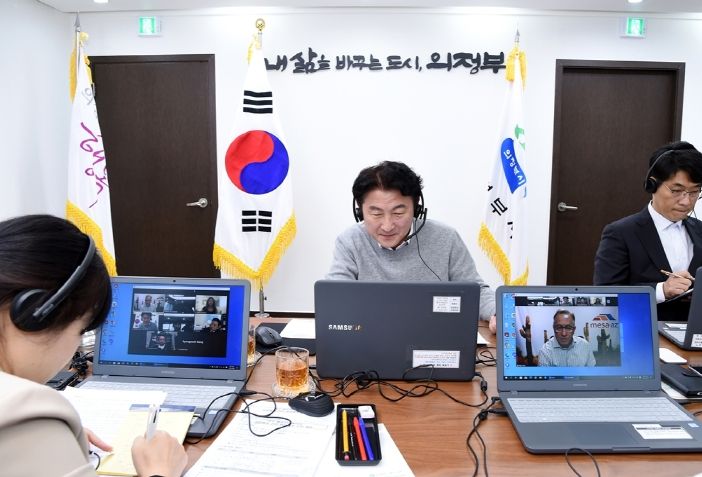 [한국기자연대] 의정부시는 4월 6일(목) 미국 애리조나주 메사시와 국제교류 협력을 위한 시장 간 온라인 화상회의를 가졌다.