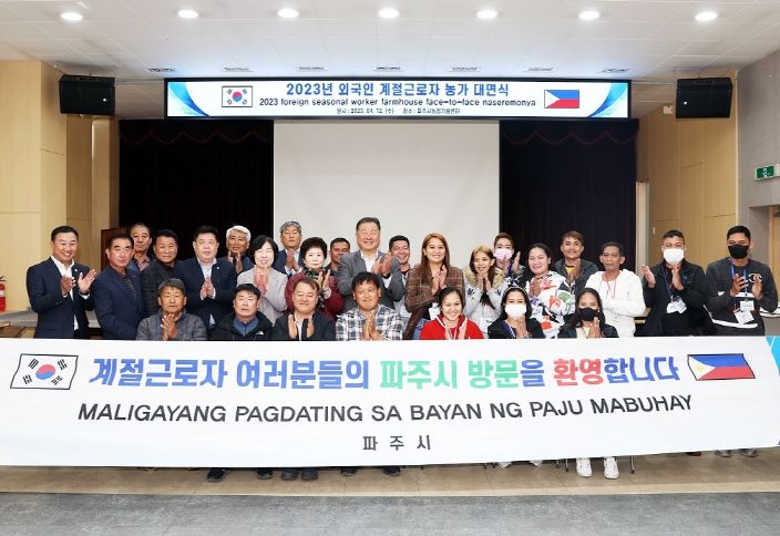 [한국기자연대] 파주시는 12일 농업기술센터에서 필리핀 제너럴 마리아노 알바레즈(GMA)시에서 입국하는 외국인 계절근로자를 환영하는 대면식을 가졌다.