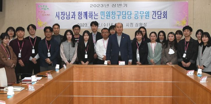 이번 간담회는 민원행정 최일선에서 각종 폭언 등에 시달리는 민원창구 직원들의 애로사항 청취 및 사기진작을 위해 마련됐다. 시청 및 각 행정복지센터 민원창구를 담당하는 직원 23명이 참석하여 고충민원 사례를 공유하고 업무개선을 위한 건의사항 등을 제안했다.