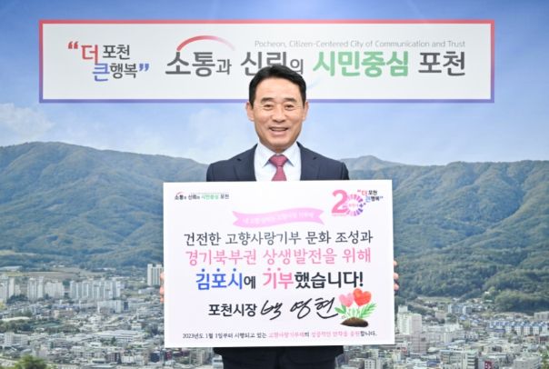 [한국기자연대] 백영현 포천시장은 지난 13일, 고향사랑기부제를 성공적으로 정착시키기 위해 진행되고 있는 ‘고향사랑기부제 인증 챌린지’에 참여했다.