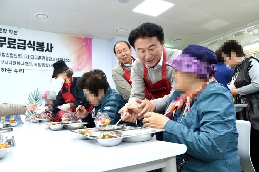 이날 김동근 의정부시장은 (사)지구촌환경감시단연합회 및 의정부시발전협의회 회원들과 함께 식사 중인 노인들에게 후식 과일을 전달하고, 손을 잡으며 인사를 나눴다.