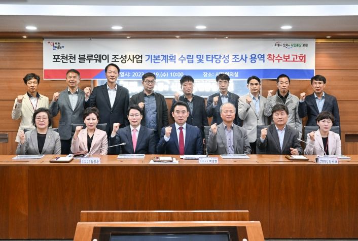 [한국기자연대] 포천시는 지난 19일 백영현 포천시장, 서과석 포천시의회의장을 비롯한 기관·단체장 등 관계자 20여 명이 참석한 가운데 ‘포천천 블루웨이 조성사업 기본계획 수립 및 타당성 조사 용역 착수보고회’를 개최했다.