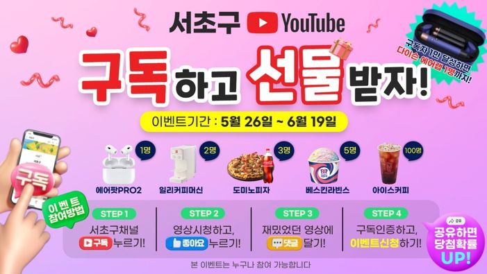 참여 방법은 유튜브 ‘서초구’ 채널을 구독하고, 이벤트 구독 영상을 시청한 후 ‘좋아요’와 ‘댓글’을 단 인증화면을 네이버폼에 이름, 연락처와 함께 응모하면 된다.