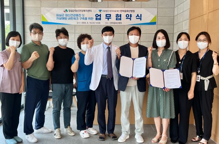 [한국기자연대] 임실군정신건강복지센터가 자살 및 정신건강 위기 대상자의 효율적인 개입과 치료 및 지역 정신건강서비스 연계 시스템 활성화를 위해 완주의료재단 한마음화산병원과 업무협약을 맺었다.