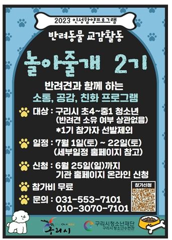 구리시청소년재단 백경현 이사장은 “반려동물과 공생하는 환경조성에 앞장서고 있는 구리시의 청소년들이 이번 프로그램을 통해 정서안정과 올바른 인성을 함양할 수 있기를 바란다.”라고 전했다.