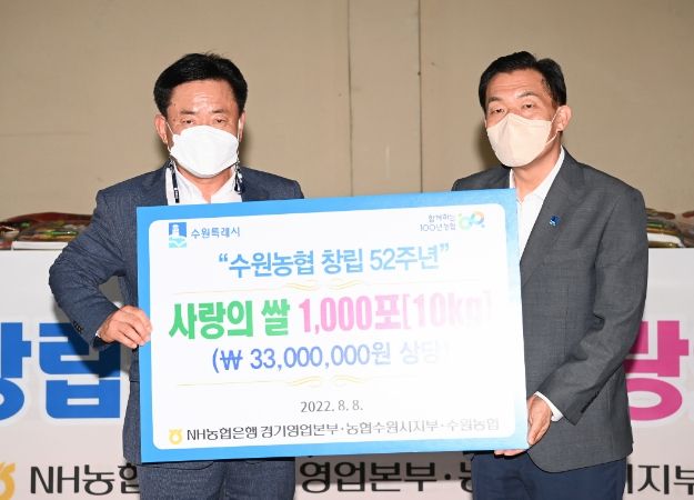 수원농협은 8일 수원농협 경제사업장에서 ‘수원농협 창립 52주년 사랑의 쌀 나눔행사’를 열고, 경기사회복지공동모금회 지정기탁 형식으로 수원시에 10㎏ 효원미 1000포(3300만 원 상당)를 전달했다. ‘효원미’는 수원에서 생산된 쌀 브랜드다.