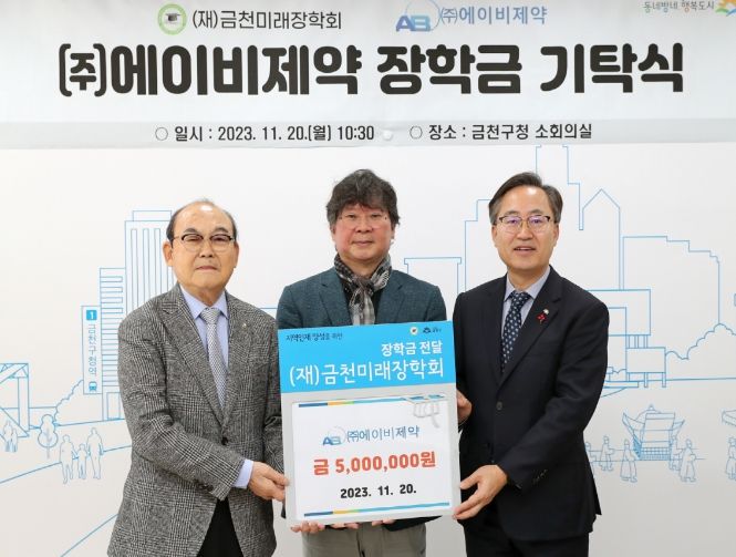 ㈜에이비제약 김을형 대표는 “비록 거주지는 금천구가 아니지만 금천구에 각별한 관심이 있다”라며, “가난이 학업의 발목을 잡지 않도록 어려운 학생에게 장학금이 전달되면 좋겠다”라고 밝혔다.