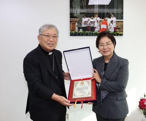 [한국기자연대] 김미경 서울 은평구청장은 23일 오전 10시 가톨릭대학교 주교관에서 염수정 추기경으로부터 감사패를 받았다.