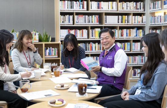 지난 21일 구청 1층 책마당 도서관은 직원들의 웃음소리로 가득했다. 이필형 동대문구청장과 직원들이 책에 대한 의견을 나누고 소통하는 자리를 가진 것이다.