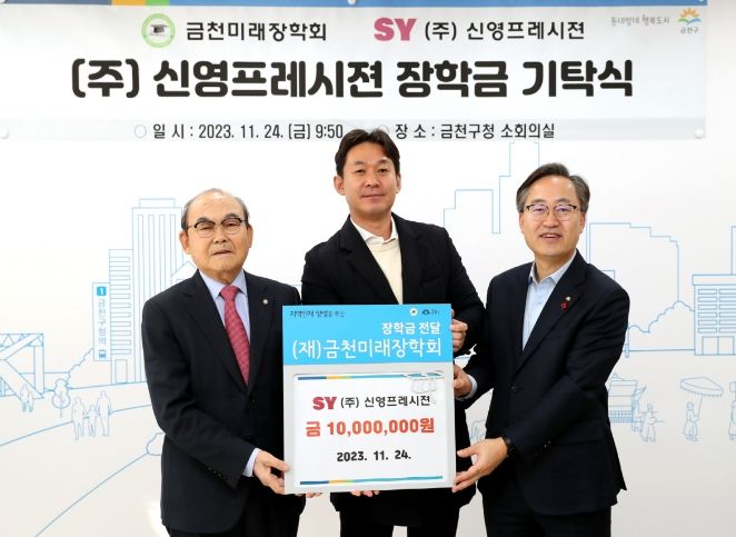 [한국기자연대] 금천구는 11월 24일 ㈜신영프레시젼에서 작년에 이어 올해에도 장학금 1,000만 원을 (재)금천미래장학회에 기탁했다고 밝혔다.