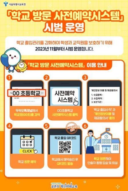 유·초·중·고·특수 68개교에서 시범 운영하는 '학교 방문 사전예약시스템'은 카카오채널에서 학교 이름을 검색한 후 방문 목적, 방문대상, 방문일시 등을 예약하여 승인을 받는 절차로 이루어진다.