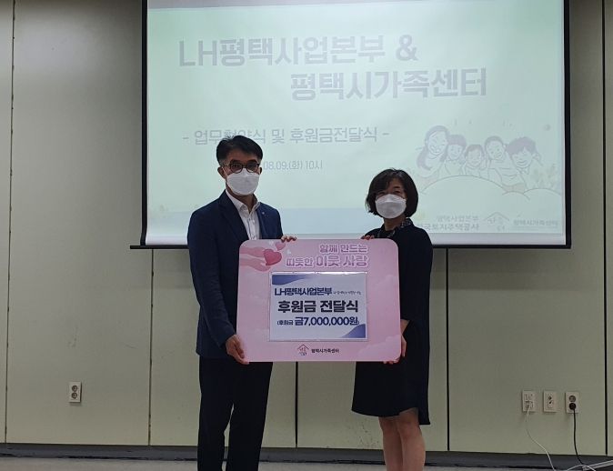 [한국기자연대] 평택시가족센터(센터장 송문영)는 지난 9일 LH평택사업본부(본부장 강신정)와 업무협약을 체결하고 후원금 전달식을 진행했다.