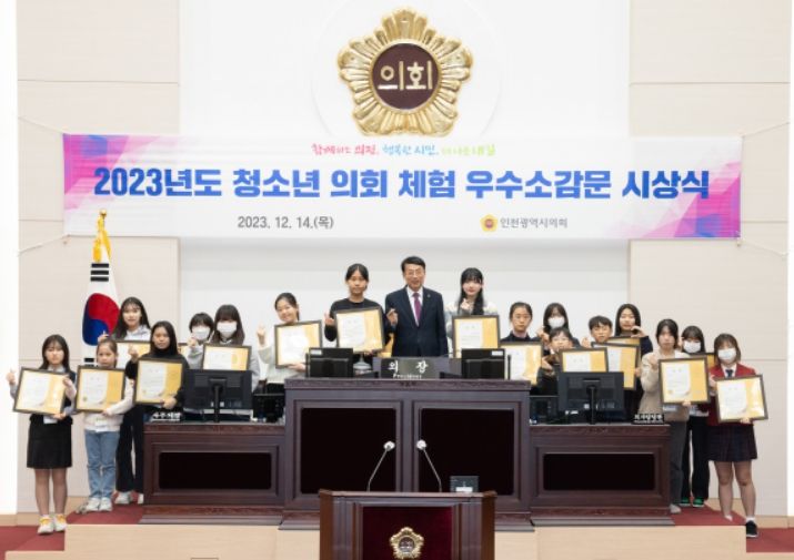 허식 의장은 “수상한 학생들을 축하하며, 인천 청소년 모두가 대한민국 민주주의를 발전시켜 나가는 자랑스러운 시민으로 성장해 주길 바란다”며 “내년에도 많은 청소년들에게 의회 체험 기회를 제공할 수 있도록 노력하겠다”고 말했다.