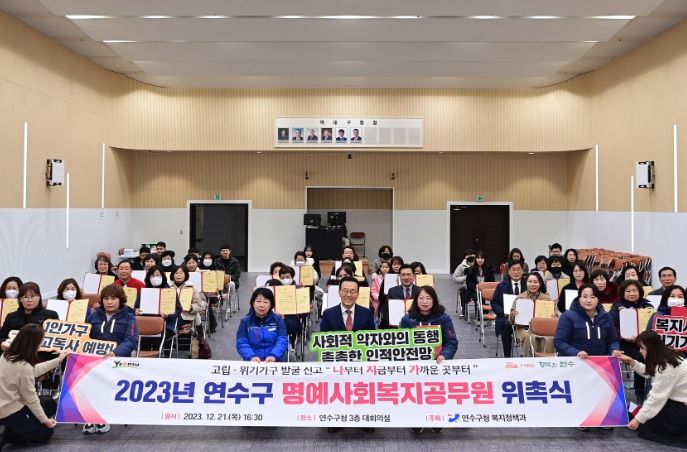 이재호 연수구청장은 “도움이 필요한 이웃을 발굴・지원하는 역할을 위해 명예사회복지공무원으로 활동해 주시는 주민분들께 감사드린다.”라며, “앞으로 연수구의 다양하고 복합적인 복지와 안전 문제에 선제적으로 대응하고 신속히 지원하겠다.”라고 말했다.