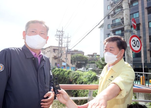 [한국기자연대] 박승원 광명시장은 16일 오전 수해 현황을 점검하기 위해 광명시를 방문한 이상민 행정안전부장관과 함께 목감천 수해 현장을 돌아보고 수재민 임시대피소인 광명종합사회복지관을 방문해 위로했다.