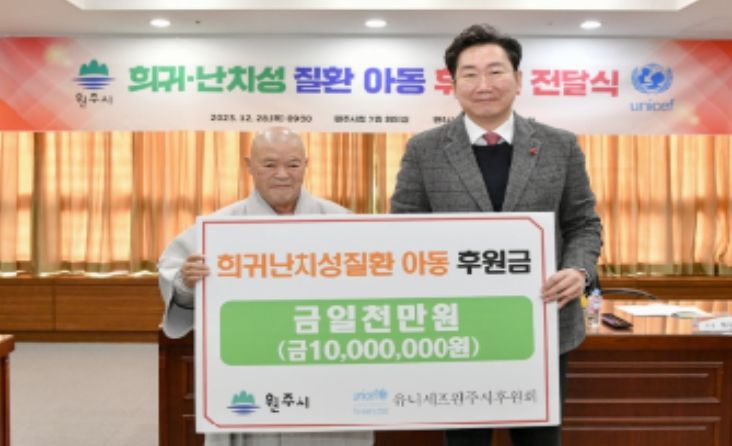 [한국기자연대] 유니세프 원주시후원회는 12월 28일 원주시청 7 층 회의실에서 희귀․난치성질환 아동을 위한 후원금 천만 원을 전달했다.