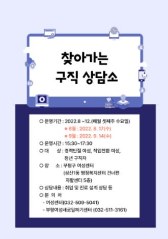 부평구 여성센터 관계자는 “이번 구직상담소를 통해 결혼·육아·가사로 꿈을 포기했던 여성들이 다시 시작 할 수 있는 발판을 제공할 것”이라고 말했다.
