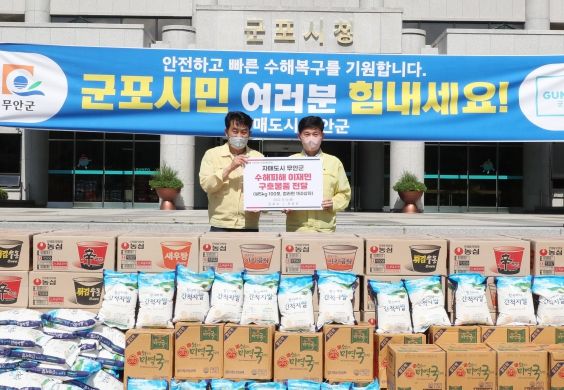 16일 군포시의 자매도시인 전남 무안군은 수해 소식을 접하고 쌀, 컵라면, 화장지 등 총 600만원 상당의 구호물품을 직접 실어와 이재민 임시 거주시설 관계자에게 전달했다.