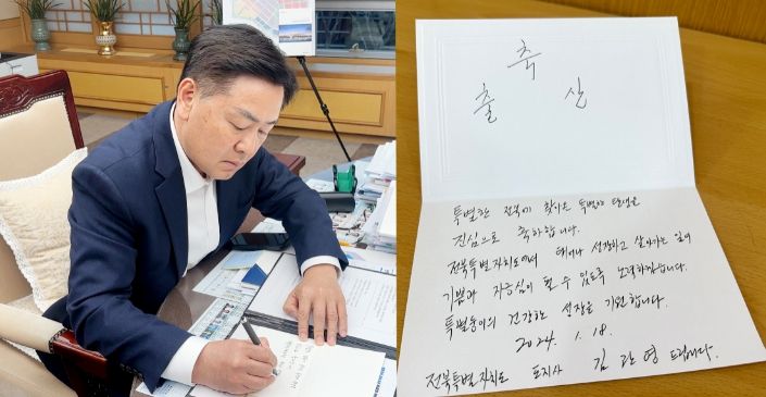 김지사는 축하카드에“특별한 전북에 찾아온 특별한 탄생을 진심으로 축하한다.”며,“전북특별자치도에서 태어나 성장하고 살아가는 일이 기쁨과 자긍심이 될 수 있도록 노력하겠다.”고 썼다.