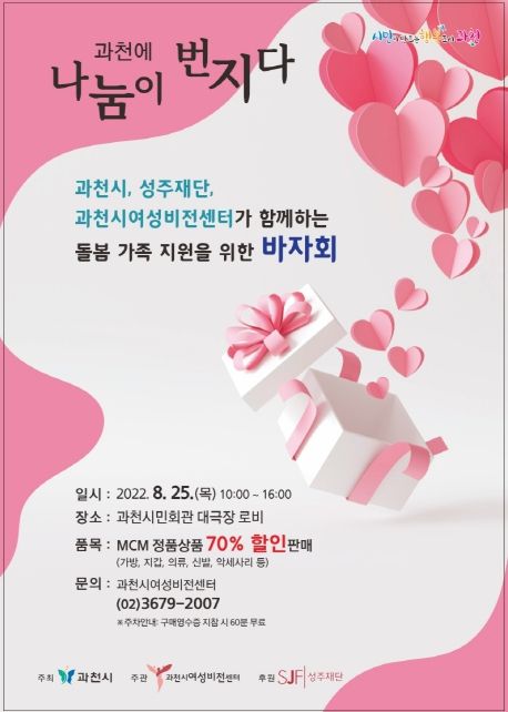 [한국기자연대] 과천시는 과천시여성비전센터, 성주재단과 함께 오는 25일 과천시민회관 대극장 로비에서 돌봄 가족 지원을 위한 바자회를 연다고 19일 밝혔다.