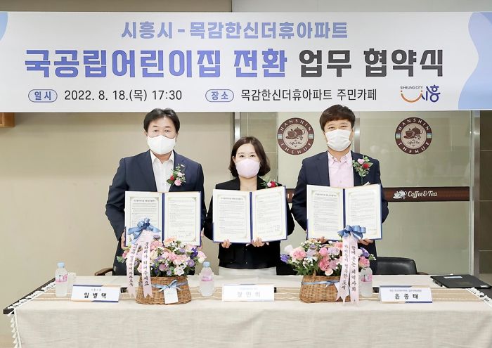 [한국기자연대] 시흥시는 지난 18일 목감한신더휴아파트 입주자대표회의와 단지 내 민간어린이집을 국공립으로 전환하는 업무 협약을 체결했다.
