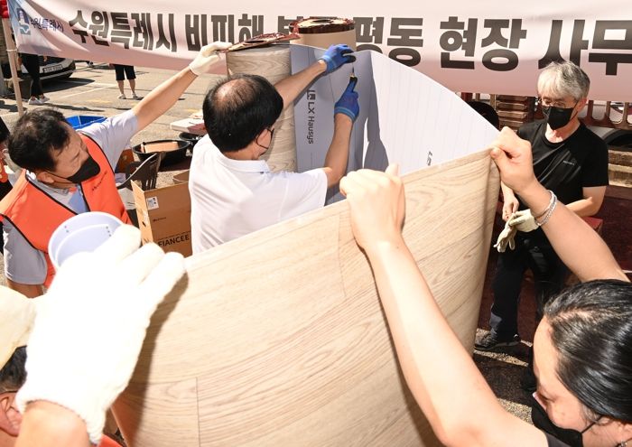19일 기준으로 희망둥지협동조합, (사)함께웃는세상, 수원시도배사협회, 한사랑길봉사단 등 11개 단체가 153가구의 도배·장판 시공을 지원하겠다고 약속했다. 침수피해 주택의 실내가 완전히 건조되는 대로 신속하게 시공할 계획이다.