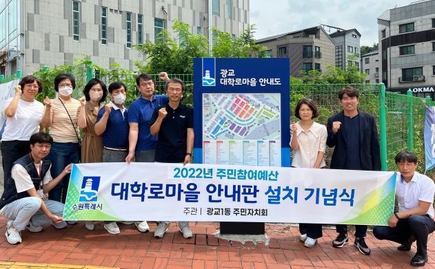 김애영 광교1동장은 “광교 대학로마을을 효과적으로 알릴 수 있는 안내판 설치를 통해 코로나 등 여파로 침체되어 있는 대학로마을 상권이 더 활성화되고 많은 분들에게 추억의 장소로 기억될 수 있기를 바란다.