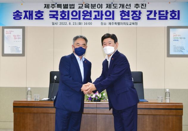 [한국기자연대] 제주특별자치도교육청은 더불어민주당 송재호 국회의원(제주 제주시갑)과 8월 23일 16시에 제주특별자치도교육청 본관 2층 상황실에서 제주특별법 교육분야 제도개선과 관련하여 현장 간담회를 가졌다.