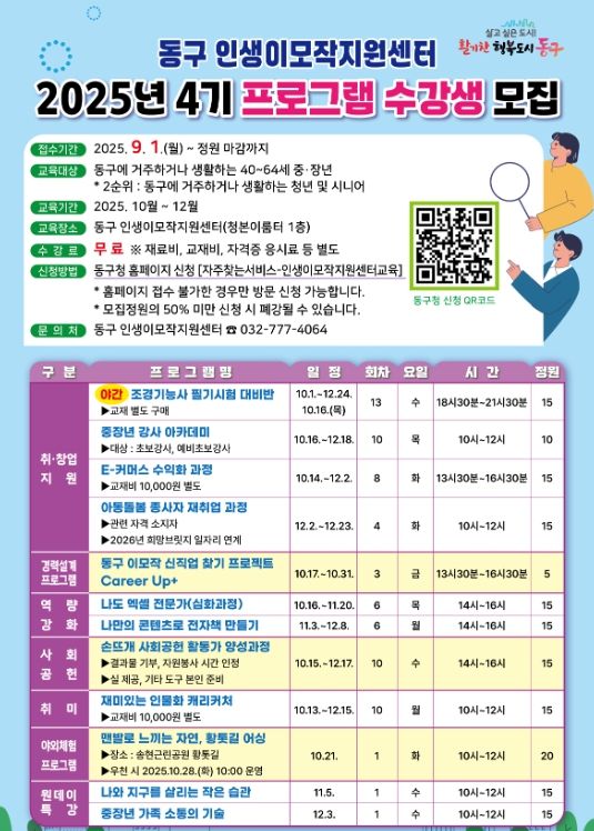 [한국기자연대] 인천 동구 인생이모작지원센터는 중장년의 새로운 도전과 재취업을 지원하기 위해 오는 9월 1일부터‘2025년 4기 동구 인생이모작지원센터 프로그램’ 수강생을 모집한다고 밝혔다.