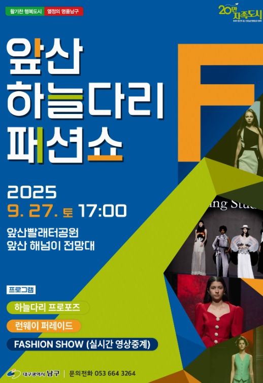 [한국기자연대] 대구 남구는 오는 9월 27일 지역의 대표 관광명소인 앞산빨래터공원에서 하늘다리 패션쇼와 프러포즈 이벤트를 개최한다고 밝혔다.