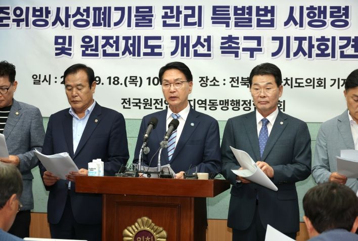 [한국기자연대] 심덕섭 고창군수가 18일 오전 전북특별자치도 도의회 브리핑룸에서 열린 전국원전인근지역동맹 행정협의회 공동 기자회견에 참여해 “시행을 앞둔 고준위핵폐기물 임시저장시설 설치를 골자로 한 ‘특별법 시행령’에 깊은 유감을 표하며 원전과 관련된 불합리한 법령 및 제도를 개선할 것”을 촉구했다.