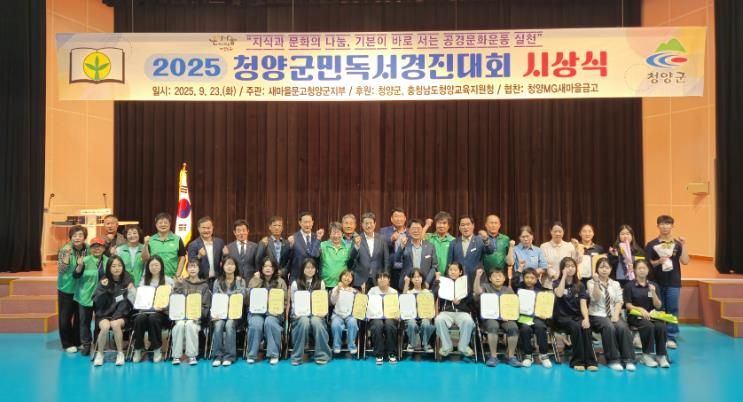 [한국기자연대] 새마을문고 청양군지부는 지난 23일 청양군 문화체육센터에서 ‘2025 청양군민 독서경진대회 시상식’을 열고, 독서문화 확산에 기여한 학생과 군민들을 격려했다.