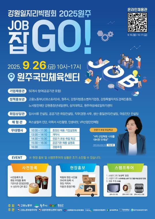 [한국기자연대] 원주시와 고용노동부는 오는 26일 오전 10시부터 오후 5시까지 원주국민체육센터에서 ‘강원일자리박람회 2025 원주 잡(JOB) GO!’를 개최한다.