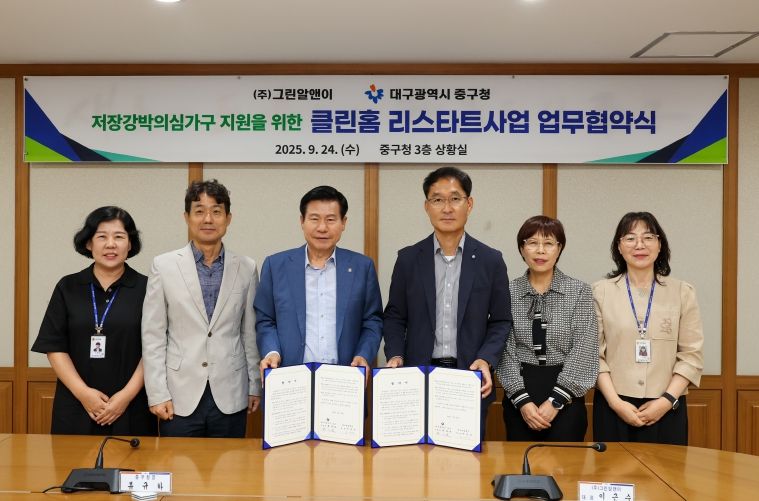 [한국기자연대] 대구 중구와 ㈜그린알앤이(대표 이근수)는 24일 저장강박의심가구 주거환경 개선과 복지안전망 강화를 위한 ‘클린홈 리스타트 사업’ 업무협약을 체결했다.